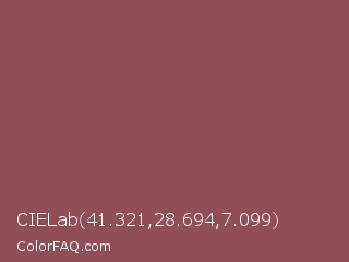 CIELab 41.321,28.694,7.099 Color is a normal red color and the nearest color is Rose Taupe #905d5d. Hex code #904e57 and RGB value is rgb(144,78,87). In RGB color space, this color is composed of 56% red, 31% green, 34% blue, In CMYK color space, this color is composed of 0% cyan, 46% magenta, 40% yellow , 44% black , In HSL color space, this color has a hue angle of 352° , 30% saturation and 44% lightness.