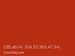 CIELab 41.324,53.363,47.34 Color is a normal red color and the nearest color is Thunderbird #c02b18. Hex code #b72e13 and RGB value is rgb(183,46,19). In RGB color space, this color is composed of 72% red, 18% green, 7% blue, In CMYK color space, this color is composed of 0% cyan, 75% magenta, 90% yellow , 28% black , In HSL color space, this color has a hue angle of 10° , 81% saturation and 40% lightness.