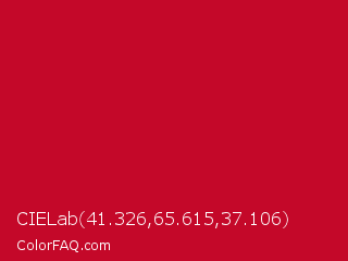 CIELab 41.326,65.615,37.106 Color is a normal red color and the nearest color is Red NCS #c40233. Hex code #c40829 and RGB value is rgb(196,8,41). In RGB color space, this color is composed of 77% red, 3% green, 16% blue, In CMYK color space, this color is composed of 0% cyan, 96% magenta, 79% yellow , 23% black , In HSL color space, this color has a hue angle of 349° , 92% saturation and 40% lightness.