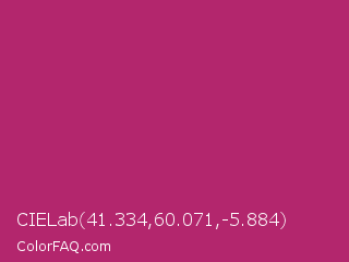 CIELab 41.334,60.071,-5.884 Color is a normal rose color and the nearest color is Hibiscus #b6316c. Hex code #b3266d and RGB value is rgb(179,38,109). In RGB color space, this color is composed of 70% red, 15% green, 43% blue, In CMYK color space, this color is composed of 0% cyan, 79% magenta, 39% yellow , 30% black , In HSL color space, this color has a hue angle of 330° , 65% saturation and 43% lightness.