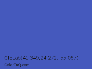 CIELab 41.349,24.272,-55.087 Color is a normal blue color and the nearest color is Indigo #4f69c6. Hex code #4559bd and RGB value is rgb(69,89,189). In RGB color space, this color is composed of 27% red, 35% green, 74% blue, In CMYK color space, this color is composed of 63% cyan, 53% magenta, 0% yellow , 26% black , In HSL color space, this color has a hue angle of 230° , 48% saturation and 51% lightness.