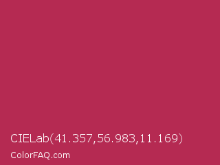 CIELab 41.357,56.983,11.169 Color is a normal rose color and the nearest color is Amaranth Purple #ab274f. Hex code #b52a52 and RGB value is rgb(181,42,82). In RGB color space, this color is composed of 71% red, 16% green, 32% blue, In CMYK color space, this color is composed of 0% cyan, 77% magenta, 55% yellow , 29% black , In HSL color space, this color has a hue angle of 343° , 62% saturation and 44% lightness.