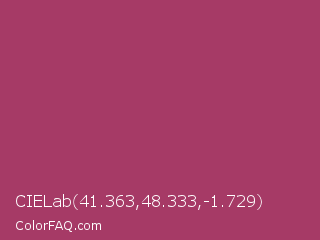 CIELab 41.363,48.333,-1.729 Color is a normal rose color and the nearest color is Rouge #a23b6c. Hex code #a63a66 and RGB value is rgb(166,58,102). In RGB color space, this color is composed of 65% red, 23% green, 40% blue, In CMYK color space, this color is composed of 0% cyan, 65% magenta, 39% yellow , 35% black , In HSL color space, this color has a hue angle of 336° , 48% saturation and 44% lightness.