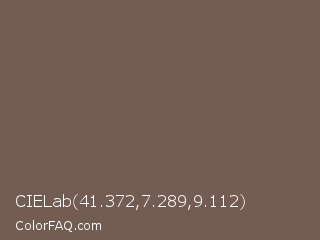 CIELab 41.372,7.289,9.112 Color is a normal orange color and the nearest color is Russett #755a57. Hex code #735d53 and RGB value is rgb(115,93,83). In RGB color space, this color is composed of 45% red, 36% green, 33% blue, In CMYK color space, this color is composed of 0% cyan, 19% magenta, 28% yellow , 55% black , In HSL color space, this color has a hue angle of 19° , 16% saturation and 39% lightness.