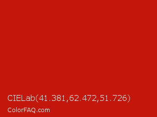 CIELab 41.381,62.472,51.726 Color is a normal red color and the nearest color is International Orange Engineering #ba160c. Hex code #c2170a and RGB value is rgb(194,23,10). In RGB color space, this color is composed of 76% red, 9% green, 4% blue, In CMYK color space, this color is composed of 0% cyan, 88% magenta, 95% yellow , 24% black , In HSL color space, this color has a hue angle of 4° , 90% saturation and 40% lightness.