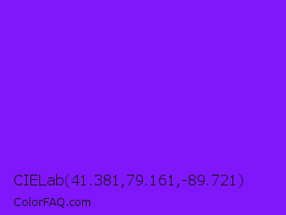 CIELab 41.381,79.161,-89.721 Color is a normal violet color and the nearest color is Violet Color Wheel #7f00ff. Hex code #8017fa and RGB value is rgb(128,23,250). In RGB color space, this color is composed of 50% red, 9% green, 98% blue, In CMYK color space, this color is composed of 49% cyan, 91% magenta, 0% yellow , 2% black , In HSL color space, this color has a hue angle of 268° , 96% saturation and 54% lightness.
