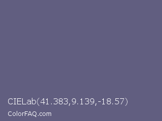 CIELab 41.383,9.139,-18.57 Color is a normal indigo color and the nearest color is Dolphin #646077. Hex code #615e80 and RGB value is rgb(97,94,128). In RGB color space, this color is composed of 38% red, 37% green, 50% blue, In CMYK color space, this color is composed of 24% cyan, 27% magenta, 0% yellow , 50% black , In HSL color space, this color has a hue angle of 245° , 15% saturation and 44% lightness.