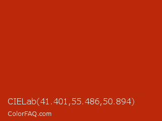 CIELab 41.401,55.486,50.894 Color is a normal red color and the nearest color is Thunderbird #c02b18. Hex code #ba2a0a and RGB value is rgb(186,42,10). In RGB color space, this color is composed of 73% red, 16% green, 4% blue, In CMYK color space, this color is composed of 0% cyan, 77% magenta, 95% yellow , 27% black , In HSL color space, this color has a hue angle of 11° , 90% saturation and 38% lightness.