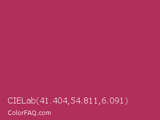 CIELab 41.404,54.811,6.091 Color is a normal rose color and the nearest color is Rich Maroon #b03060. Hex code #b12f5a and RGB value is rgb(177,47,90). In RGB color space, this color is composed of 69% red, 18% green, 35% blue, In CMYK color space, this color is composed of 0% cyan, 73% magenta, 49% yellow , 31% black , In HSL color space, this color has a hue angle of 340° , 58% saturation and 44% lightness.