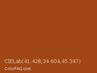 CIELab 41.428,34.604,45.347 Color is a normal orange color and the nearest color is Hawaiian Tan #9d5616. Hex code #a14714 and RGB value is rgb(161,71,20). In RGB color space, this color is composed of 63% red, 28% green, 8% blue, In CMYK color space, this color is composed of 0% cyan, 56% magenta, 88% yellow , 37% black , In HSL color space, this color has a hue angle of 22° , 78% saturation and 35% lightness.
