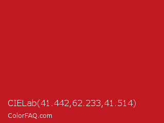 CIELab 41.442,62.233,41.514 Color is a normal red color and the nearest color is Carnelian #b31b1b. Hex code #c11921 and RGB value is rgb(193,25,33). In RGB color space, this color is composed of 76% red, 10% green, 13% blue, In CMYK color space, this color is composed of 0% cyan, 87% magenta, 83% yellow , 24% black , In HSL color space, this color has a hue angle of 357° , 77% saturation and 43% lightness.