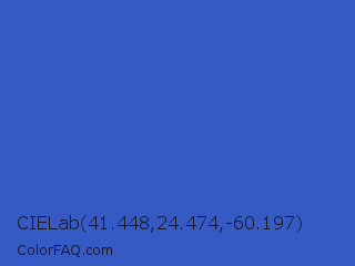 CIELab 41.448,24.474,-60.197 Color is a normal blue color and the nearest color is Cerulean Blue #2a52be. Hex code #355ac6 and RGB value is rgb(53,90,198). In RGB color space, this color is composed of 21% red, 35% green, 78% blue, In CMYK color space, this color is composed of 73% cyan, 55% magenta, 0% yellow , 22% black , In HSL color space, this color has a hue angle of 225° , 58% saturation and 49% lightness.
