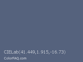 CIELab 41.449,1.915,-16.73 Color is a normal blue color and the nearest color is Paynes Grey #536878. Hex code #55627d and RGB value is rgb(85,98,125). In RGB color space, this color is composed of 33% red, 38% green, 49% blue, In CMYK color space, this color is composed of 32% cyan, 22% magenta, 0% yellow , 51% black , In HSL color space, this color has a hue angle of 221° , 19% saturation and 41% lightness.