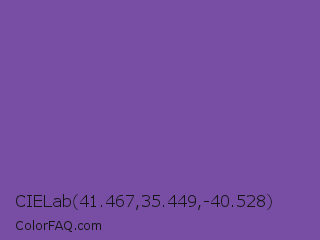 CIELab 41.467,35.449,-40.528 Color is a normal violet color and the nearest color is Royal Purple #7851a9. Hex code #784ea5 and RGB value is rgb(120,78,165). In RGB color space, this color is composed of 47% red, 31% green, 65% blue, In CMYK color space, this color is composed of 27% cyan, 53% magenta, 0% yellow , 35% black , In HSL color space, this color has a hue angle of 269° , 36% saturation and 48% lightness.