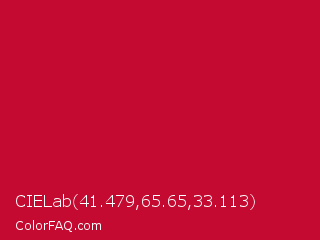 CIELab 41.479,65.65,33.113 Color is a normal red color and the nearest color is Red NCS #c40233. Hex code #c40a30 and RGB value is rgb(196,10,48). In RGB color space, this color is composed of 77% red, 4% green, 19% blue, In CMYK color space, this color is composed of 0% cyan, 95% magenta, 76% yellow , 23% black , In HSL color space, this color has a hue angle of 348° , 90% saturation and 40% lightness.
