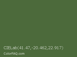 CIELab 41.47,-20.462,22.917 Color is a normal green color and the nearest color is Chalet Green #516e3d. Hex code #4c6a3b and RGB value is rgb(76,106,59). In RGB color space, this color is composed of 30% red, 42% green, 23% blue, In CMYK color space, this color is composed of 28% cyan, 0% magenta, 44% yellow , 58% black , In HSL color space, this color has a hue angle of 98° , 28% saturation and 32% lightness.