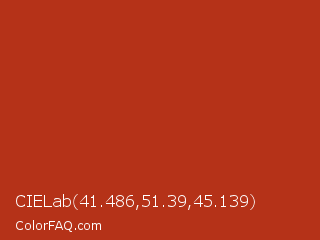 CIELab 41.486,51.39,45.139 Color is a normal red color and the nearest color is Thunderbird #c02b18. Hex code #b53218 and RGB value is rgb(181,50,24). In RGB color space, this color is composed of 71% red, 20% green, 9% blue, In CMYK color space, this color is composed of 0% cyan, 72% magenta, 87% yellow , 29% black , In HSL color space, this color has a hue angle of 10° , 77% saturation and 40% lightness.