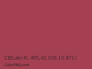 CIELab 41.495,42.035,10.871 Color is a normal red color and the nearest color is English Red #ab4b52. Hex code #a34152 and RGB value is rgb(163,65,82). In RGB color space, this color is composed of 64% red, 25% green, 32% blue, In CMYK color space, this color is composed of 0% cyan, 60% magenta, 50% yellow , 36% black , In HSL color space, this color has a hue angle of 350° , 43% saturation and 45% lightness.