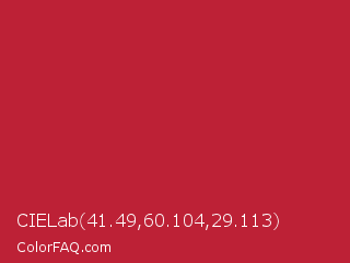 CIELab 41.49,60.104,29.113 Color is a normal red color and the nearest color is Cardinal #c41e3a. Hex code #bd2136 and RGB value is rgb(189,33,54). In RGB color space, this color is composed of 74% red, 13% green, 21% blue, In CMYK color space, this color is composed of 0% cyan, 83% magenta, 71% yellow , 26% black , In HSL color space, this color has a hue angle of 352° , 70% saturation and 44% lightness.