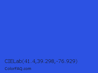 CIELab 41.4,39.298,-76.929 Color is a normal blue color and the nearest color is Palatinate Blue #273be2. Hex code #2c52e3 and RGB value is rgb(44,82,227). In RGB color space, this color is composed of 17% red, 32% green, 89% blue, In CMYK color space, this color is composed of 81% cyan, 64% magenta, 0% yellow , 11% black , In HSL color space, this color has a hue angle of 228° , 77% saturation and 53% lightness.