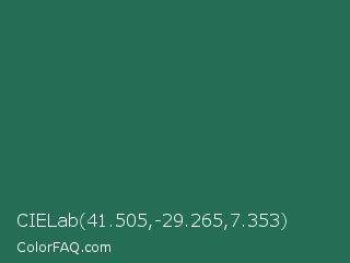 CIELab 41.505,-29.265,7.353 Color is a dark green color and the nearest color is Dark Spring Green #177245. Hex code #246e55 and RGB value is rgb(36,110,85). In RGB color space, this color is composed of 14% red, 43% green, 33% blue, In CMYK color space, this color is composed of 67% cyan, 0% magenta, 23% yellow , 57% black , In HSL color space, this color has a hue angle of 160° , 51% saturation and 29% lightness.