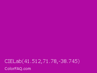 CIELab 41.512,71.78,-38.745 Color is a normal magenta color and the nearest color is Heliotrope Magenta #aa00bb. Hex code #b109a3 and RGB value is rgb(177,9,163). In RGB color space, this color is composed of 69% red, 4% green, 64% blue, In CMYK color space, this color is composed of 0% cyan, 95% magenta, 8% yellow , 31% black , In HSL color space, this color has a hue angle of 305° , 90% saturation and 36% lightness.
