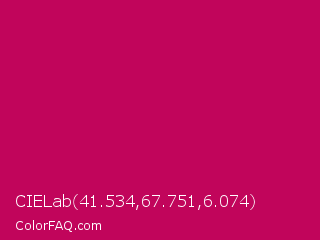 CIELab 41.534,67.751,6.074 Color is a normal rose color and the nearest color is Pictorial Carmine #c30b4e. Hex code #c1055b and RGB value is rgb(193,5,91). In RGB color space, this color is composed of 76% red, 2% green, 36% blue, In CMYK color space, this color is composed of 0% cyan, 97% magenta, 53% yellow , 24% black , In HSL color space, this color has a hue angle of 333° , 95% saturation and 39% lightness.