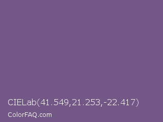 CIELab 41.549,21.253,-22.417 Color is a normal purple color and the nearest color is Dark Lavender #734f96. Hex code #735787 and RGB value is rgb(115,87,135). In RGB color space, this color is composed of 45% red, 34% green, 53% blue, In CMYK color space, this color is composed of 15% cyan, 36% magenta, 0% yellow , 47% black , In HSL color space, this color has a hue angle of 275° , 22% saturation and 44% lightness.