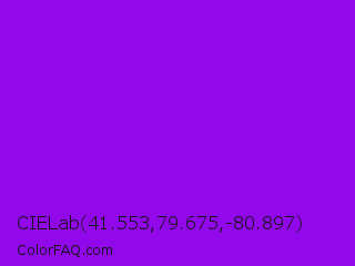 CIELab 41.553,79.675,-80.897 Color is a normal purple color and the nearest color is Electric Violet #8f00ff. Hex code #9109eb and RGB value is rgb(145,9,235). In RGB color space, this color is composed of 57% red, 4% green, 92% blue, In CMYK color space, this color is composed of 38% cyan, 96% magenta, 0% yellow , 8% black , In HSL color space, this color has a hue angle of 276° , 93% saturation and 48% lightness.