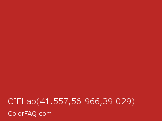 CIELab 41.557,56.966,39.029 Color is a normal red color and the nearest color is Tall Poppy #b32d29. Hex code #bb2825 and RGB value is rgb(187,40,37). In RGB color space, this color is composed of 73% red, 16% green, 15% blue, In CMYK color space, this color is composed of 0% cyan, 79% magenta, 80% yellow , 27% black , In HSL color space, this color has a hue angle of 1° , 67% saturation and 44% lightness.
