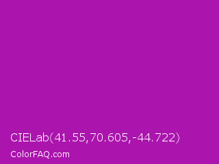 CIELab 41.55,70.605,-44.722 Color is a normal magenta color and the nearest color is Heliotrope Magenta #aa00bb. Hex code #ab15ad and RGB value is rgb(171,21,173). In RGB color space, this color is composed of 67% red, 8% green, 68% blue, In CMYK color space, this color is composed of 1% cyan, 88% magenta, 0% yellow , 32% black , In HSL color space, this color has a hue angle of 299° , 78% saturation and 38% lightness.