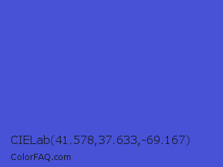 CIELab 41.578,37.633,-69.167 Color is a normal blue color and the nearest color is Iris #5a4fcf. Hex code #4752d6 and RGB value is rgb(71,82,214). In RGB color space, this color is composed of 28% red, 32% green, 84% blue, In CMYK color space, this color is composed of 67% cyan, 62% magenta, 0% yellow , 16% black , In HSL color space, this color has a hue angle of 235° , 64% saturation and 56% lightness.