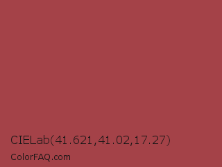 CIELab 41.621,41.02,17.27 Color is a normal red color and the nearest color is English Red #ab4b52. Hex code #a44248 and RGB value is rgb(164,66,72). In RGB color space, this color is composed of 64% red, 26% green, 28% blue, In CMYK color space, this color is composed of 0% cyan, 60% magenta, 56% yellow , 36% black , In HSL color space, this color has a hue angle of 356° , 43% saturation and 45% lightness.