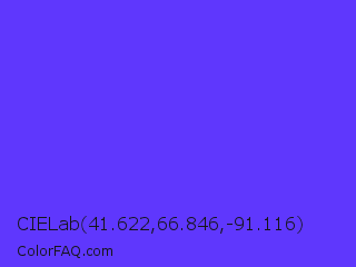 CIELab 41.622,66.846,-91.116 Color is a normal indigo color and the nearest color is Han Purple #5218fa. Hex code #5f37fd and RGB value is rgb(95,55,253). In RGB color space, this color is composed of 37% red, 22% green, 99% blue, In CMYK color space, this color is composed of 62% cyan, 78% magenta, 0% yellow , 1% black , In HSL color space, this color has a hue angle of 252° , 98% saturation and 60% lightness.
