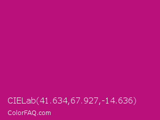 CIELab 41.634,67.927,-14.636 Color is a normal magenta color and the nearest color is Red Violet #c71585. Hex code #ba107c and RGB value is rgb(186,16,124). In RGB color space, this color is composed of 73% red, 6% green, 49% blue, In CMYK color space, this color is composed of 0% cyan, 91% magenta, 33% yellow , 27% black , In HSL color space, this color has a hue angle of 322° , 84% saturation and 40% lightness.