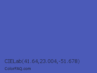 CIELab 41.64,23.004,-51.678 Color is a normal blue color and the nearest color is Liberty #545aa7. Hex code #4b5ab8 and RGB value is rgb(75,90,184). In RGB color space, this color is composed of 29% red, 35% green, 72% blue, In CMYK color space, this color is composed of 59% cyan, 51% magenta, 0% yellow , 28% black , In HSL color space, this color has a hue angle of 232° , 43% saturation and 51% lightness.