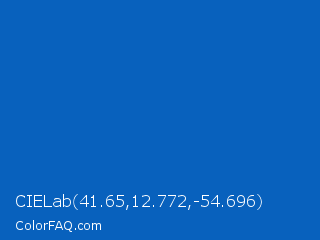 CIELab 41.65,12.772,-54.696 Color is a normal blue color and the nearest color is Denim #1560bd. Hex code #0861bd and RGB value is rgb(8,97,189). In RGB color space, this color is composed of 3% red, 38% green, 74% blue, In CMYK color space, this color is composed of 96% cyan, 49% magenta, 0% yellow , 26% black , In HSL color space, this color has a hue angle of 210° , 92% saturation and 39% lightness.