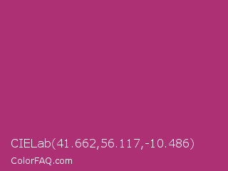 CIELab 41.662,56.117,-10.486 Color is a normal magenta color and the nearest color is Royal Heath #ab3472. Hex code #ad3075 and RGB value is rgb(173,48,117). In RGB color space, this color is composed of 68% red, 19% green, 46% blue, In CMYK color space, this color is composed of 0% cyan, 72% magenta, 32% yellow , 32% black , In HSL color space, this color has a hue angle of 327° , 57% saturation and 43% lightness.