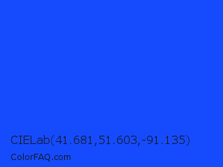 CIELab 41.681,51.603,-91.135 Color is a normal blue color and the nearest color is Blue RYB #0247fe. Hex code #164bfd and RGB value is rgb(22,75,253). In RGB color space, this color is composed of 9% red, 29% green, 99% blue, In CMYK color space, this color is composed of 91% cyan, 70% magenta, 0% yellow , 1% black , In HSL color space, this color has a hue angle of 226° , 98% saturation and 54% lightness.