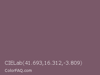 CIELab 41.693,16.312,-3.809 Color is a normal rose color and the nearest color is Falcon #7f626d. Hex code #7a5969 and RGB value is rgb(122,89,105). In RGB color space, this color is composed of 48% red, 35% green, 41% blue, In CMYK color space, this color is composed of 0% cyan, 27% magenta, 14% yellow , 52% black , In HSL color space, this color has a hue angle of 331° , 16% saturation and 41% lightness.