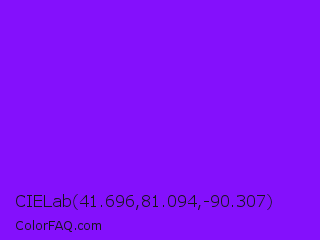 CIELab 41.696,81.094,-90.307 Color is a normal violet color and the nearest color is Violet Color Wheel #7f00ff. Hex code #8410fc and RGB value is rgb(132,16,252). In RGB color space, this color is composed of 52% red, 6% green, 99% blue, In CMYK color space, this color is composed of 48% cyan, 94% magenta, 0% yellow , 1% black , In HSL color space, this color has a hue angle of 269° , 98% saturation and 53% lightness.