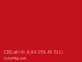 CIELab 41.6,64.059,45.511 Color is a normal red color and the nearest color is Venetian Red #c80815. Hex code #c4121a and RGB value is rgb(196,18,26). In RGB color space, this color is composed of 77% red, 7% green, 10% blue, In CMYK color space, this color is composed of 0% cyan, 91% magenta, 87% yellow , 23% black , In HSL color space, this color has a hue angle of 357° , 83% saturation and 42% lightness.