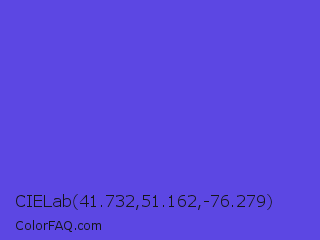 CIELab 41.732,51.162,-76.279 Color is a normal indigo color and the nearest color is Majorelle Blue #6050dc. Hex code #5c47e3 and RGB value is rgb(92,71,227). In RGB color space, this color is composed of 36% red, 28% green, 89% blue, In CMYK color space, this color is composed of 59% cyan, 69% magenta, 0% yellow , 11% black , In HSL color space, this color has a hue angle of 248° , 74% saturation and 58% lightness.