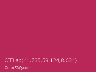 CIELab 41.735,59.124,8.634 Color is a normal rose color and the nearest color is Rose Red #c21e56. Hex code #b82757 and RGB value is rgb(184,39,87). In RGB color space, this color is composed of 72% red, 15% green, 34% blue, In CMYK color space, this color is composed of 0% cyan, 79% magenta, 53% yellow , 28% black , In HSL color space, this color has a hue angle of 340° , 65% saturation and 44% lightness.