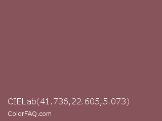 CIELab 41.736,22.605,5.073 Color is a normal red color and the nearest color is Rose Taupe #905d5d. Hex code #88545b and RGB value is rgb(136,84,91). In RGB color space, this color is composed of 53% red, 33% green, 36% blue, In CMYK color space, this color is composed of 0% cyan, 38% magenta, 33% yellow , 47% black , In HSL color space, this color has a hue angle of 352° , 24% saturation and 43% lightness.