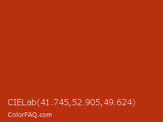 CIELab 41.745,52.905,49.624 Color is a normal red color and the nearest color is Thunderbird #c02b18. Hex code #b8300e and RGB value is rgb(184,48,14). In RGB color space, this color is composed of 72% red, 19% green, 5% blue, In CMYK color space, this color is composed of 0% cyan, 74% magenta, 92% yellow , 28% black , In HSL color space, this color has a hue angle of 12° , 86% saturation and 39% lightness.