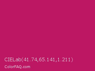 CIELab 41.74,65.141,1.211 Color is a normal rose color and the nearest color is Rose Red #c21e56. Hex code #bd1763 and RGB value is rgb(189,23,99). In RGB color space, this color is composed of 74% red, 9% green, 39% blue, In CMYK color space, this color is composed of 0% cyan, 88% magenta, 48% yellow , 26% black , In HSL color space, this color has a hue angle of 333° , 78% saturation and 42% lightness.