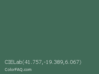 CIELab 41.757,-19.389,6.067 Color is a normal green color and the nearest color is Mineral Green #3f5d53. Hex code #416b58 and RGB value is rgb(65,107,88). In RGB color space, this color is composed of 25% red, 42% green, 35% blue, In CMYK color space, this color is composed of 39% cyan, 0% magenta, 18% yellow , 58% black , In HSL color space, this color has a hue angle of 153° , 24% saturation and 34% lightness.