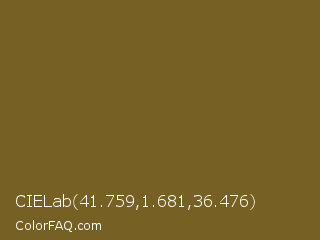 CIELab 41.759,1.681,36.476 Color is a dark orange color and the nearest color is Himalaya #6a5d1b. Hex code #766024 and RGB value is rgb(118,96,36). In RGB color space, this color is composed of 46% red, 38% green, 14% blue, In CMYK color space, this color is composed of 0% cyan, 19% magenta, 69% yellow , 54% black , In HSL color space, this color has a hue angle of 44° , 53% saturation and 30% lightness.