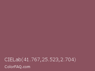 CIELab 41.767,25.523,2.704 Color is a normal red color and the nearest color is Rose Taupe #905d5d. Hex code #8b525f and RGB value is rgb(139,82,95). In RGB color space, this color is composed of 55% red, 32% green, 37% blue, In CMYK color space, this color is composed of 0% cyan, 41% magenta, 32% yellow , 45% black , In HSL color space, this color has a hue angle of 346° , 26% saturation and 43% lightness.